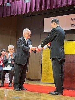 1月30日(金)午後2時より神戸市兵庫区役所湊川ホールにて、兵庫警察官の年間優秀署員お二人への菊水賞贈呈式が行われました。これは永年に渡り神戸ウエストライオンズクラブが後援しています式典で当日は約400人の神戸市兵庫区の各種団体のからの参加者の前で、神戸ウエストライオンズクラブ会長門野正一より記念品贈呈が対象のお二人の兵庫警察署員さんに贈られました。また兵庫防犯協会会長の藤井よりお二人の受賞理由が読み上げられました。この日はこの式典の後、安全・安心まちづくり兵庫区民大会も開催され、兵庫防犯協会会長の藤井の開会挨拶のあと、兵庫県警音楽隊の演奏や、落語家による出前寄席もあり楽しい大会となりました。